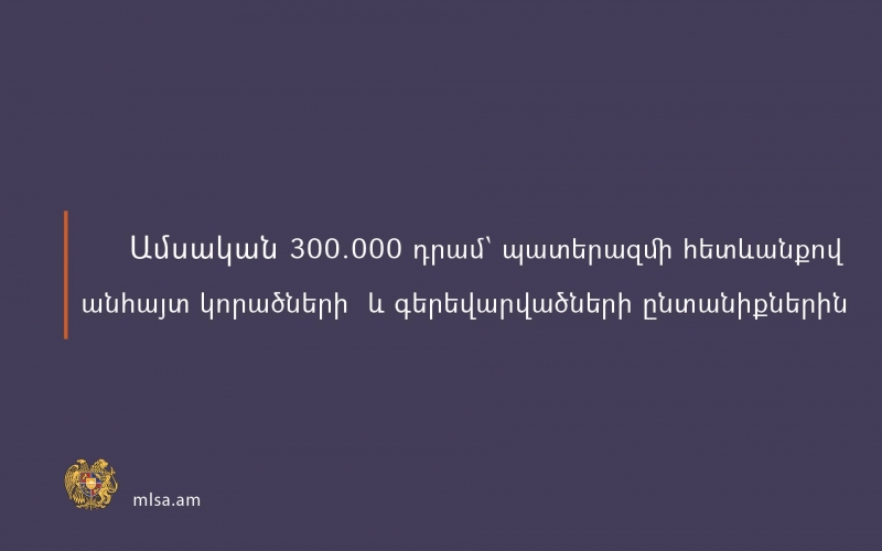 ՀՀ Կառավարությունը տեղեկացնում է, որ պատերազմի հետևանքով անհայտ կորած և գերեվարված զինծառայողների ընտանիքներին կտրամադրվի ամսական 300.000 դրամ աջակցություն՝ առավելագույնը 6 ամիս ժամկետով։