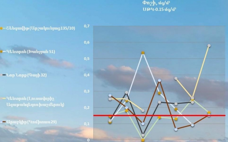 Փոշու պարունակությունը գերազանցել է սահմանային թույլատրելի կոնցենտրացիան Կենտրոն վարչական շրջանում ամբողջ շաբաթվա ընթացքում, Արաբկիրում՝ հուլիսի 1-ին, 2-ին, 4-ին և 7-ին, Նոր Նորքում՝ հուլիսի 2-ին, 4-6-ը Շենգավիթում՝ հունիսի 2-ին, 6-ին և 7-ին: