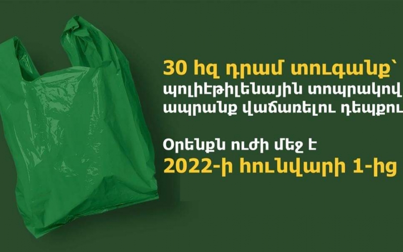 Անցած գարնանը՝ ապրիլին, Ազգային ժողովը փոփոխություն կատարեց «Առևտրի և ծառայությունների մասին» օրենքում։ Համաձայն փոփոխության, 2022 թ. հունվարի 1-ից առևտրի օբյեկտներում և առևտրի իրականացման վայրերում արգելվում է մինչև 50 միկրոն հաստությամբ պոլիէթիլենային տոպրակների վաճառքը։