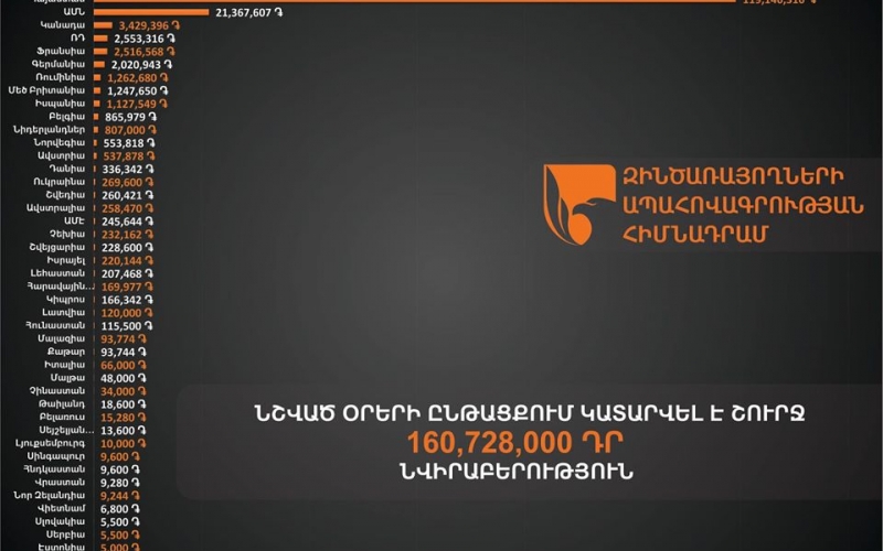 Զինծառայողների ապահովագրության հիմնադրամին 17․07․2020-21.07.2020թ.-ի ընթացքում ժամը 14։30-ի դրությամբ կատարվել է շուրջ 160,728,000 ՀՀ դրամի նվիրաբերություն։