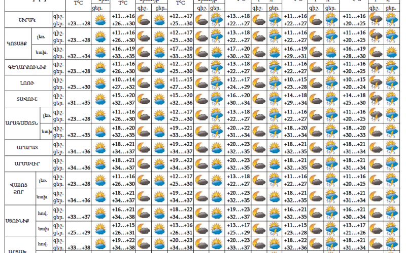 Հուլիսի 9-11-ին երեկոյան ժամերին քաղաքի առանձին հատվածներում սպասվում է կարճատև անձրև և ամպրոպ, ամպրոպի ժամանակ սպասվում է քամու ուժգնացում՝ 17-19մ/վրկ: