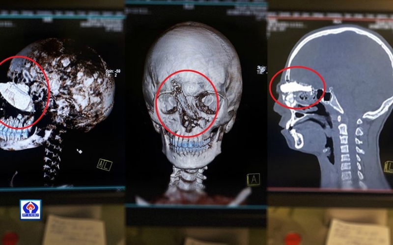 Ունի բաց թափանցող գանգուղեղային վնավածքներ, քթի, ճակատոսկրի, մաղոսկրի, աջ ակնակապիճի միջային պատի բազմաբեկոր կոտրվածքներ: Ճակատային բլթի կոնտուզիոն հեմոռագիկ օջախ: